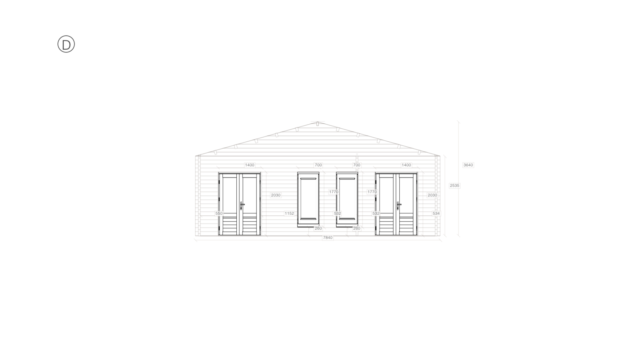 Manufactured to order, this spacious design encompasses 30m² of interior space within 7.8m x 4.3m external walls. The 70mm glue-laminated timber walls frame an internal volume of 7.5m x 4.0m with 2535mm sidewalls and a ridge height of 3640mm under the apex (gable) roof. Fenestration comprises 2 windows and 2 doors arranged per the specified floor plan, all beneath a 16.0° apex roof covering 40.4m². No off-the-shelf components are used in this log cabin; every element is cut and machined to the project-specific measurements, delivering a truly bespoke result for the dealer and their end client.